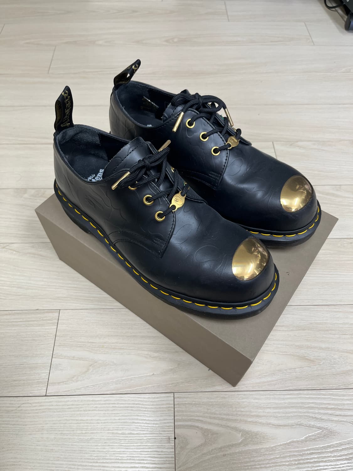 닥터마틴과 베이프 콜라보 1461 블랙 슈즈입니다. 은은하게 들어가 있는 베이프 문양이 매력적인 제품입니다. Size: 270 (EU42) Condition 9/ 10 제품 단품