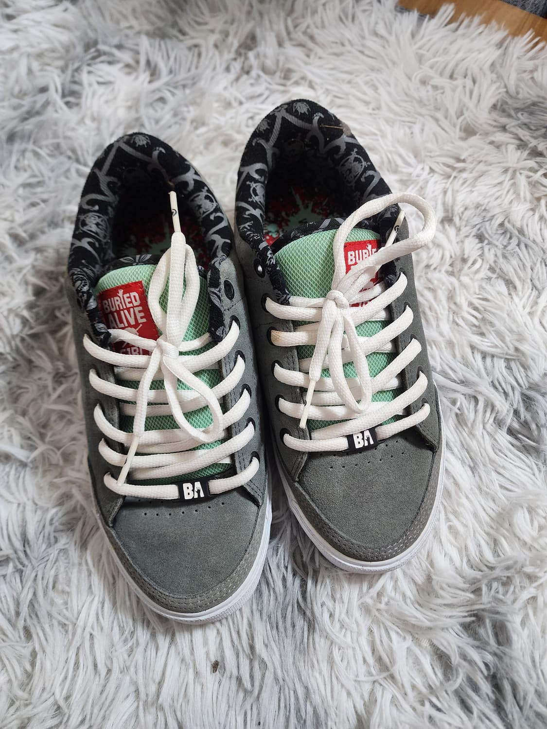 서카와 Buried Alive가 협업한 AL50 스니커즈입니다. 독특한 콜라보 디자인이 돋보이네요. 스웨이드 재질로 보이는 회색 갑피가 인상적입니다. 별도 문의 없으시면 바로 안전결제 부탁드려요! 중고거래특성상 반품 환불 안됩니다