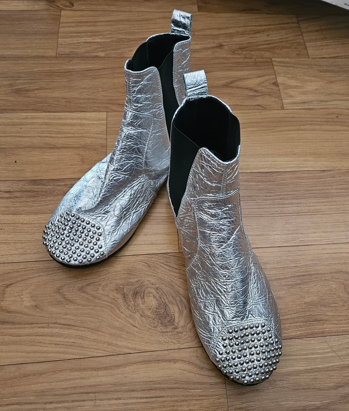 이태리 고가브랜드 하쉬 실버 스터드 천연가죽 숏부츠입니다. 현대백화점에서 구입후 거의 신지않은 새상품급의 상태로 굽은 0.5센티정도에요. 실버가 약간 링클처리되어 빈티지하면서 멋진 부츠에요. 앞부분 스터드가 포인트로 다양하게 코디할 수 있는 아이템입니다. 36사이즈로 230정도 잘 맞으실듯 합니다. 반품은 불가한 점 양해해주세요.