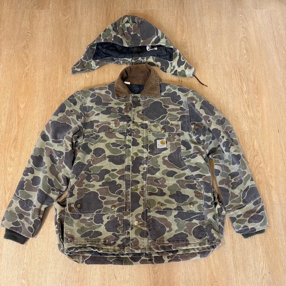 80s 칼하트 카모 워크 자켓 표기사이즈 m 후드, 뒷면 보호커버 탈부착 가능 오른쪽 카라 부분 수선필요