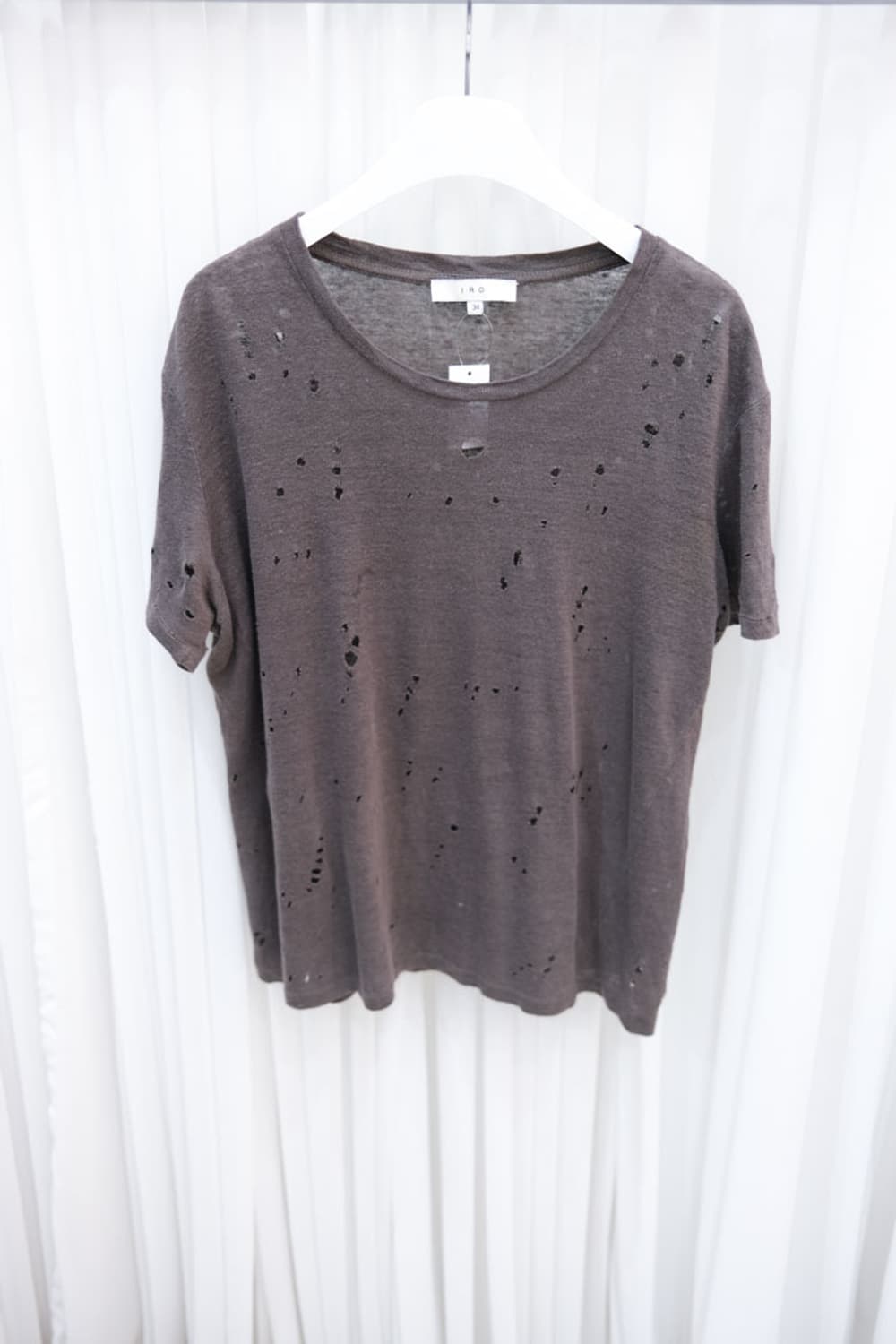 IRO º Size (바닥에 두어서 최대로 측정) 어깨 48cm 가슴 55cm 팔 18cm 총장 55cm º IRO 티셔츠입니다. 디스트로이드 디테일이 더해진 빈티지한 무드의 티셔츠로 SS 시즌 활용도 높은 아이템입니다.