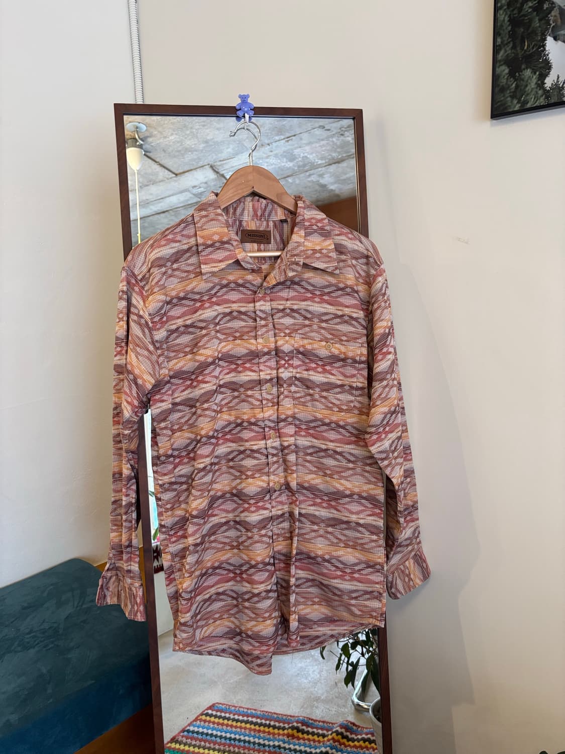 미쏘니 특유의 패턴이 돋보이는 셔츠입니다. 은은한 색감 조합이 고급스러움을 더합니다. 어깨 50 팔 62.5 가슴 56.5 기장 앞76 뒤79 사이즈 오차1~2cm 발생 할 수 있음