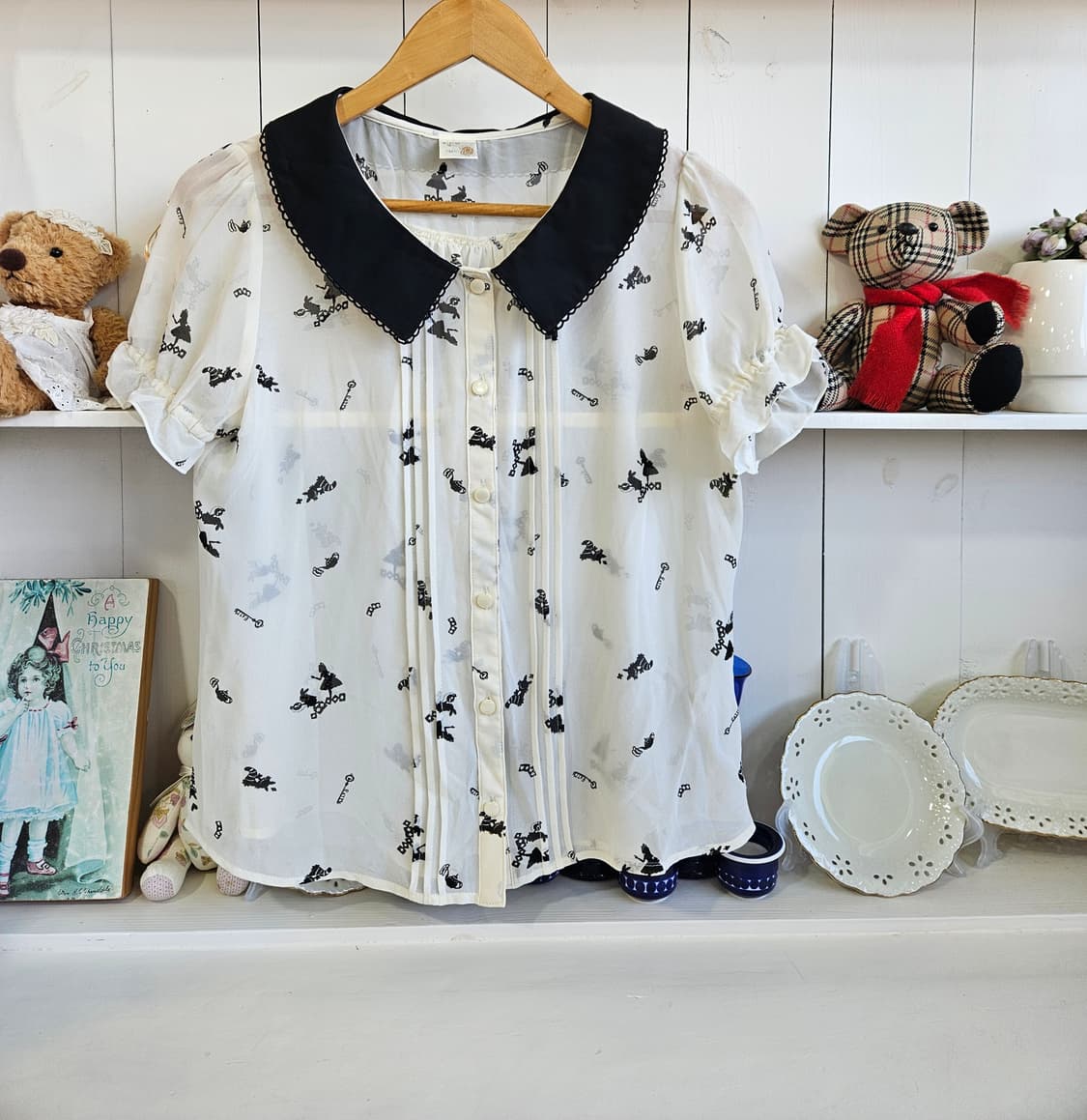 애로우(ARROW) 앨리스 프린팅 빅카라 쉬폰 블라우스 잔잔하게 들어간 앨리스 캐릭터 + 열쇠 모티브 패턴이 포인트인 동화감성 제대로 살린 블라우스입니다. 블랙 빅카라 + 레이스 라인 디테일로 단정하면서도 러블리한 무드 나오고, 얇은 쉬폰 소재라 입었을 때 여리하게 흐르는 핏이 진짜 예쁜 타입이에요. 실측 가슴단면 47 총장 53 라벨 표기 M 소재 폴리 쉬폰
