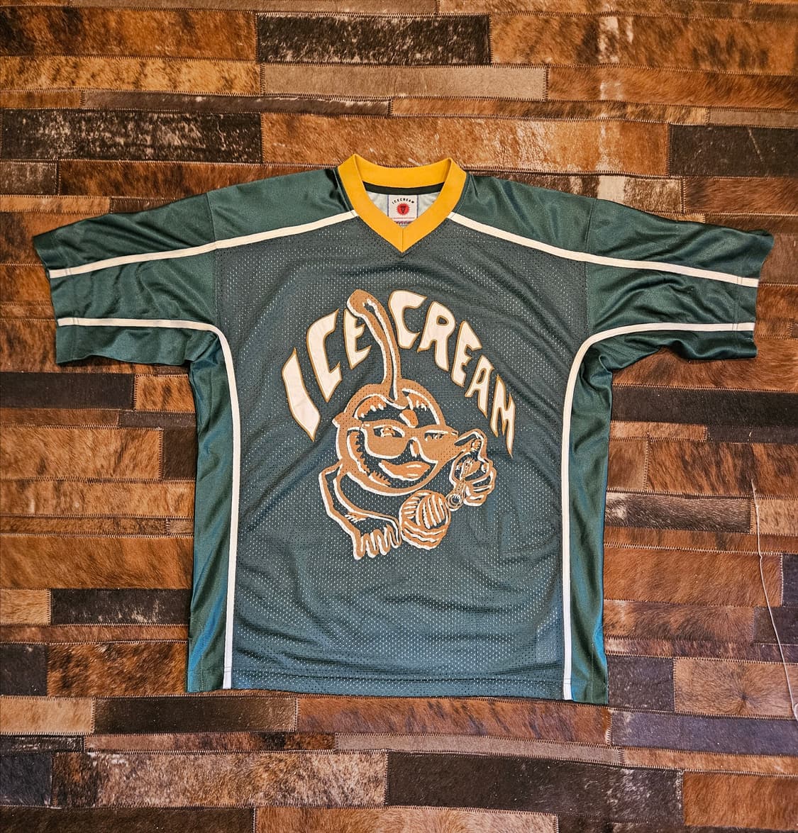 ICECREAM 로고 메쉬 져지 티셔츠 스트리트웨어 특유의 자유로운 감성과 위트 있는 그래픽이 돋보이는 ICECREAM의 메쉬 져지입니다. 딥그린 컬러 바디에 옐로우 브이넥 포인트, 그리고 전면을 가득 채운 ICECREAM 시그니처 캐릭터 그래픽이 강한 존재감을 보여주는 제품으로, 단 한 장만으로도 룩의 분위기를 확실하게 완성해주는 아이템입니다. 통기성이 좋은 메쉬 텍스처와 여유로운 실루엣이 만나 편안하면서도 힙한 무드를 연출해주며, 스포츠 져지 특유의 활동적인 느낌과 스트리트 패션의 감각적인 디자인이 조화롭게 담겨 있습니다. 데님, 와이드 팬츠, 카고 팬츠, 반바지 등과 매치했을 때 특히 매력적이며, 남녀 모두 트렌디하게 스타일링하기 좋은 제품입니다. -- 브랜드 소개 ICECREAM(아이스크림)은 유니크한 그래픽 감성과 팝적인 컬러 사용, 그리고 자유분방한 스트리트 무드로 많은 사랑을 받아온 브랜드입니다. 스트리트웨어 신에서 독창적인 세계관과 상징적인 캐릭터 디자인으로 강한 팬층을 형성해왔으며, 단순한 의류를 넘어 개성과 문화적 감각을 표현하는 브랜드로 자리 잡아왔습니다. 특히 ICECREAM은 스트리트 패션 특유의 에너지와 장난기, 그리고 아트워크적인 요소를 결합해 “기본적인 옷 한 벌도 확실한 스타일의 중심이 될 수 있다”는 브랜드 아이덴티티를 보여줍니다. 그래서 ICECREAM의 제품은 평범한 캐주얼을 넘어, 착용하는 사람의 취향과 분위기를 더욱 선명하게 드러내주는 매력이 있습니다. -- 상품 포인트 전면의 대형 ICECREAM 그래픽 로고로 확실한 포인트 딥그린 바디와 옐로우 넥라인 조합의 뛰어난 컬러 밸런스 메쉬 원단 특유의 가볍고 쾌적한 착용감 어깨선이 자연스럽게 떨어지는 여유로운 실루엣 스트리트 / 스포티 / 빈티지 무드까지 다양하게 연출 가능 단독 착용만으로도 스타일이 완성되는 존재감 있는 디자인 -- 스타일링 추천 이 제품은 하나만 입어도 충분히 포인트가 살아나는 져지 티셔츠입니다. 와이드 데님과 매치하면 클래식한 스트리트 무드가 살아나고, 카고 팬츠와 함께 코디하면 보다 터프하고 트렌디한 분위기를 연출할 수 있습니다. 반바지와 스니커즈를 더하면 여름철에도 가볍고 센스 있게 착용 가능하며, 오버핏 이너웨어 감성으로 레이어드 스타일링에도 잘 어울립니다. 특히 그래픽이 강한 제품인 만큼, 하의는 비교적 심플하게 매치해주면 상의의 매력이 더욱 살아나며 룩 전체가 세련되게 정리됩니다. -- 실측 사이즈 표기 사이즈: S 어깨: 56cm 가슴: 65cm 팔길이: 26cm 총길이: 74cm ※ 측정 방법에 따라 약간의 오차가 있을 수 있습니다. -- 추천 체형 / 핏감 표기상 S 사이즈이지만, 실측 기준으로는 여유 있는 편이라 평소 루즈핏 또는 세미오버핏을 선호하시는 분들께 추천드립니다. 체형에 따라 자연스럽게 떨어지는 스트리트 핏으로 연출 가능하며, 실측 꼭 참고 후 구매 부탁드립니다. -- 한줄 요약 ICECREAM 특유의 위트 있는 그래픽과 스포티한 메쉬 져지 감성이 완벽하게 담긴, 소장가치 높은 스트리트 아이템. -- 교환 반품은 절대 사절 입니다 신중한 선택 부탁 드립니다 택배비는 착불 입니다
