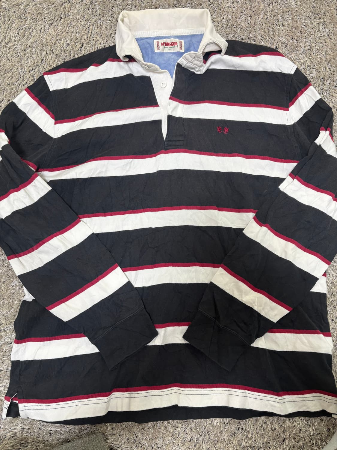 일본판 MCGREGOR 럭비 긴팔 티셔츠입니다. 검정색, 흰색, 빨간색의 조화가 잘 이루어진 스트라이프 패턴이 돋보입니다. 사이즈는 100-105로, L 사이즈입니다. 목부분 오염이있어서 세탁 하시면 좋아질것같습니다. 실측 어깨 가슴 팔 총 50-55-60-74 택배거래만 가능합니다. 교환 환불 반품 안되는점 양해바랍니다. 마지막으로 정말 옷을 팔때는 항상 흠을 찾으려고 노력하고 내가 못입는옷은 절대 팔지 않고 아끼는 옷들만 올렸으니 모든 사람의 마음에 들고 싶지만 그렇지 못할수도 있다는점 양해바랍니다. 새상품이라고 표시되어있지 않으면 중고상품이니 어느정도 감안해서 봐주시면 너무 감사하겠습니다.