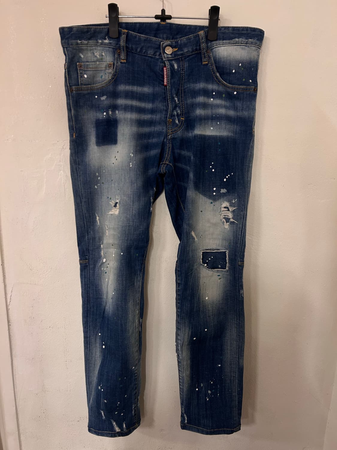 디스퀘어드2 쿨가이핏 워싱 데님 팬츠입니다. 독특한 워싱과 페인트 디테일이 돋보이는 개성 있는 디자인입니다. 사이즈는 50이며, 이탈리아 제작 제품입니다. 스타일리시한 코디를 연출하기 좋은 아이템입니다. 총장 실측 100 허리단면 실측 45cm (약 35~36인치 정도) ※ 제품 특성상 교환 및 환불은 불가하오니 구매 전 충분한 확인 부탁드립니다. 배송비 안내 반값택배 2,000원 일반택배 4,000원
