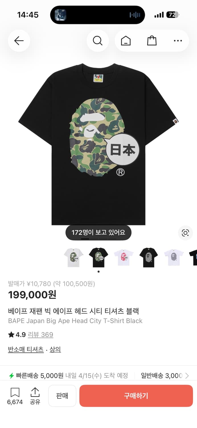 블랙 색상의 베이프 반팔 티셔츠입니다. 일본 한정 카모 디자인이 포인트입니다. 사이즈 L이며. 문의 없으시면 바로 안전결제해주시면 됩니다! 목 늘어남 살짝 있고 다른 하자는 없습니다.