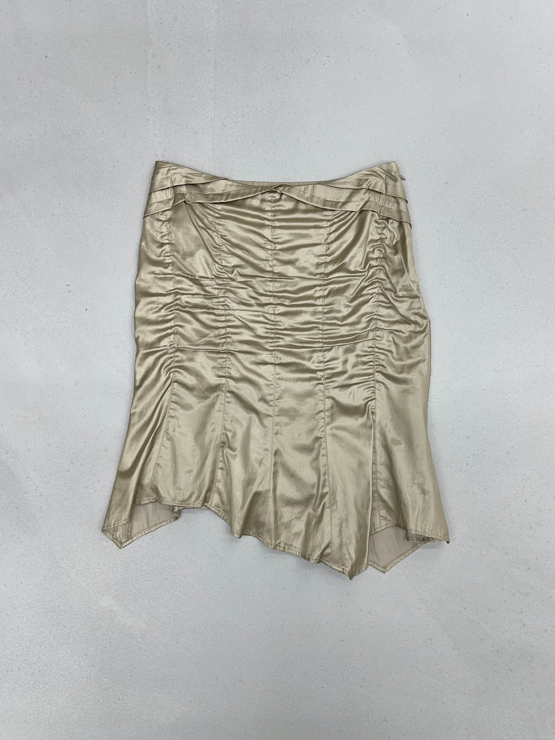 허리35 총장52(cm)(약27.5inch) PINKY&DIANNE 스커트 입니다. 폴리58 코튼42 혼방 소재이며 셔링 디테일, 컬러, 광택감 등이 특징이네요. 사이즈는 실측을 참고해 주세요!