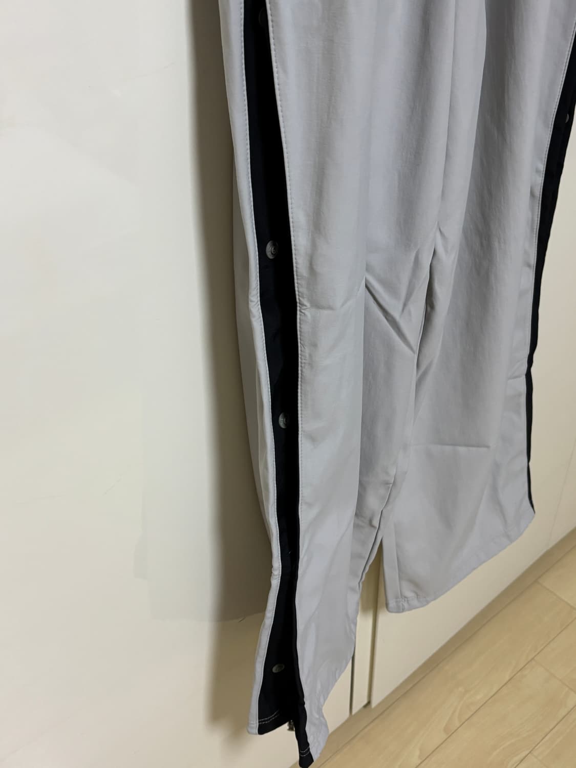 사진과 같은 그레이색으로 양 사이드에 버튼이 달려 원하는 실루엣으로 조절 가능합니다 밑단에 스트링도 달려있어 기장조절에도 문제없는 팬츠입니다
