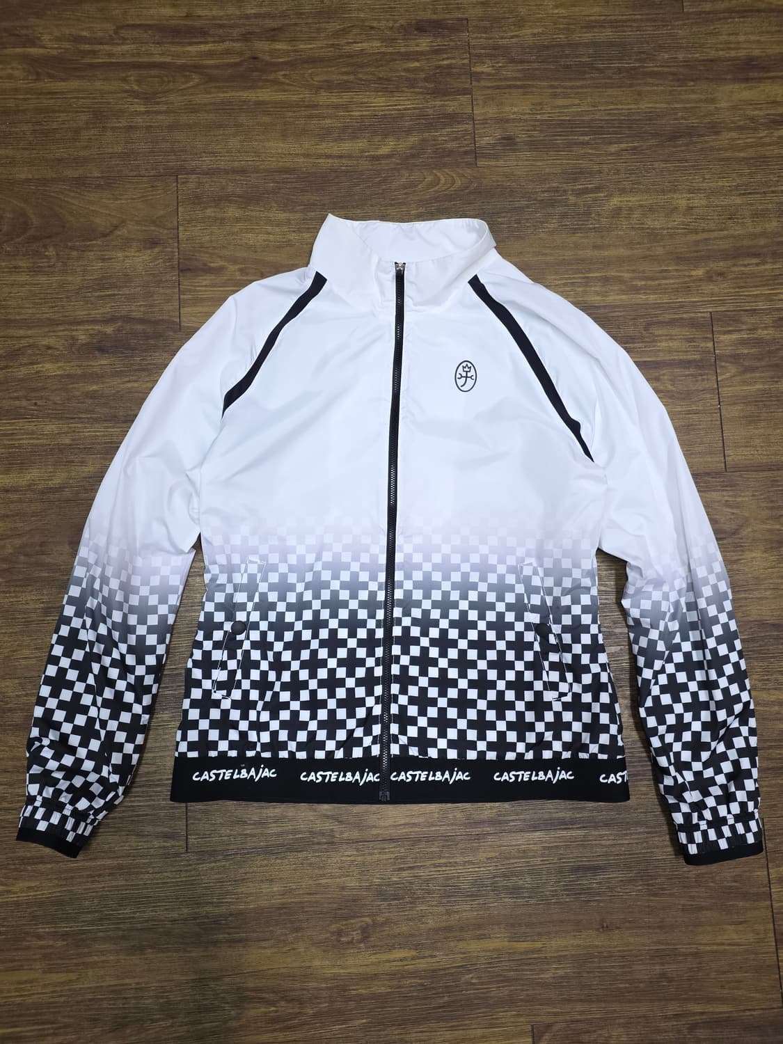 카스텔바작 여성 바람막이 자켓입니다. 흰색 바탕에 하단 흑백 격자무늬 포인트가 들어가 있습니다. 가볍게 라운딩할 때 걸치기 좋은 옷입니다. 별도 문의 없으시면 바로 안전결제 부탁드려요! 상품명: 카스텔바작 여성 바람막이 색상: 흰검 사이즈:95 실측사이즈: 어깨나그랑. 가슴51 총장 58팔길이70