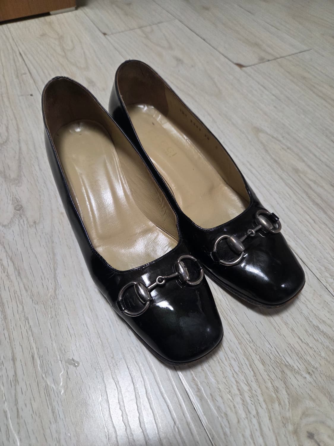 구찌 구두입니다. 28사이즈로 한국사이즈로 250 정도합니다. 에나멜 소재로 광택감 있습니다. 사용안한지 오래되서 자연스러운 사용감 외에 큰 하자는 없어요 구두집가셔서 수선하시면 새신처럼 신으 실 수 있을 것 같아요 수선비 생각해서 저렴하게 넘겨요