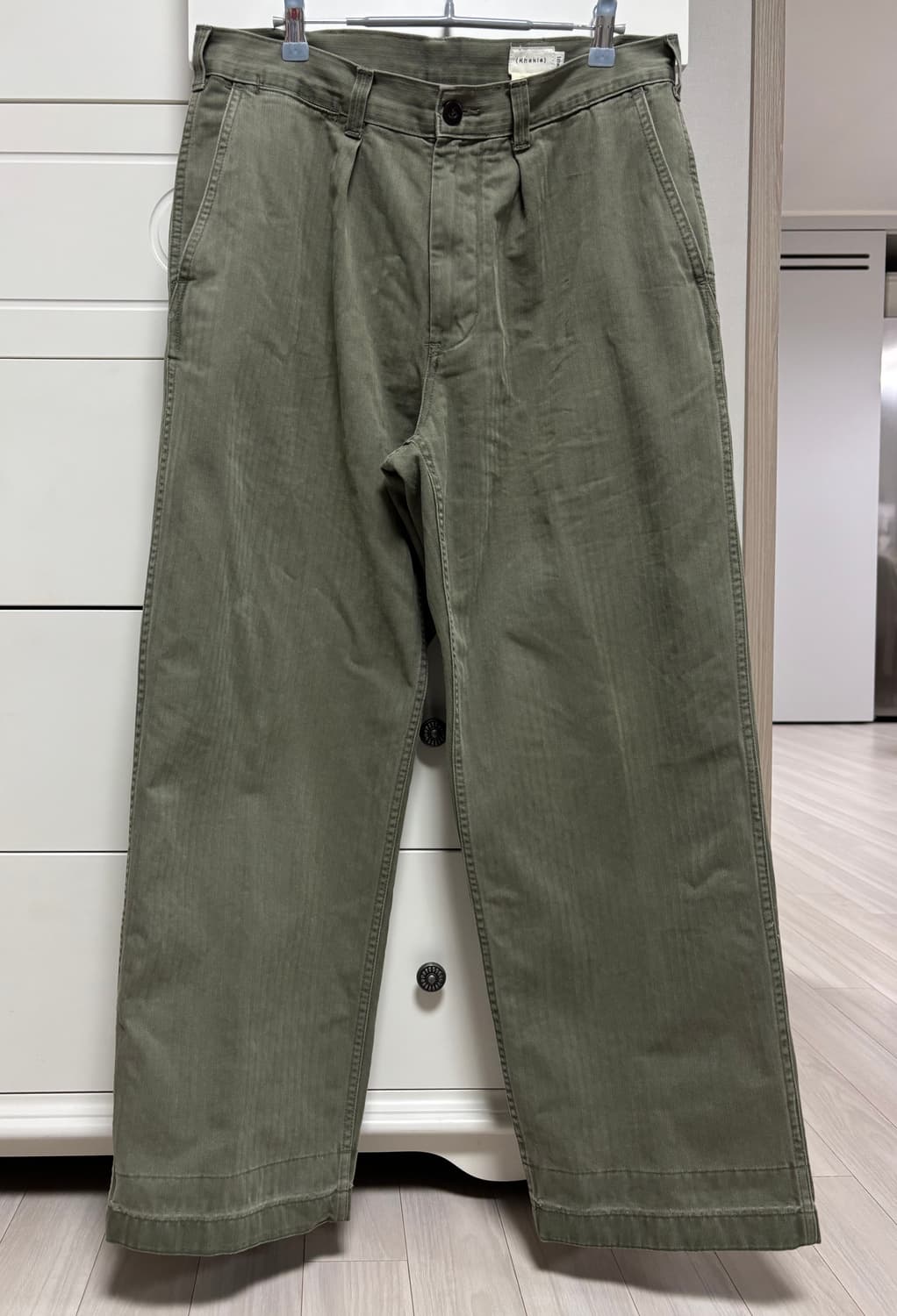 브랜드 : 카키스 모델명 : KHAKIS HBT Port Pant Olive 색상 : 올리브 사이즈 : M 실측 32인치: 허리42 허벅지36.5 밑단25 외측총기장102 보충설명 : 26SS 카키스 HBT 헤링본패턴 신상 팬츠입니다. - 워싱된 색감과 루즈한 핏, 디테일들이 너무너무 멋진 팬츠입니다. 일본산 헤링본 트윌 원단이라 재질감 또한 고급스럽습니다. - 이번 4월 올리브, 에크루색상 2개 구입하였는데 아무래도 하나는 보내줘야 할 것 같습니다. - 착용횟수 딱 한번 단시간 착용한 SS급 새제품 컨디션입니다. - 무수선