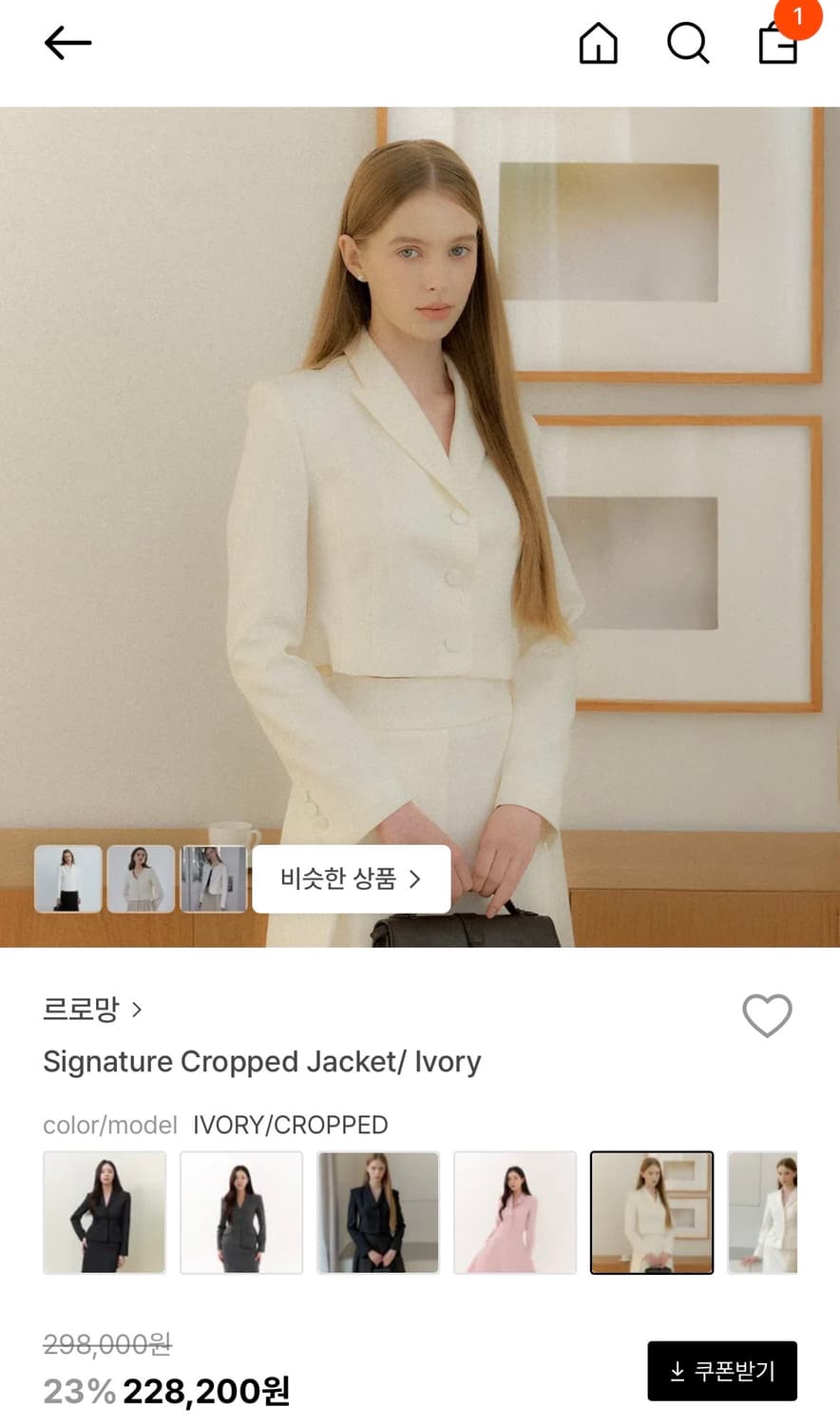 아이보리 색상의 르로망 크롭 자켓입니다. (스커트 미포함) 깔끔한 디자인이라 격식 있는 자리에도 잘 어울립니다. 1사이즈(55) 제품으로 1회 착용했습니다.