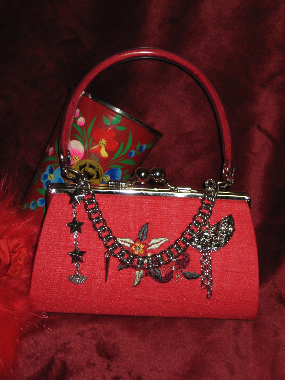 오리엔탈 스타 레드자수 클러치백 체인메이드