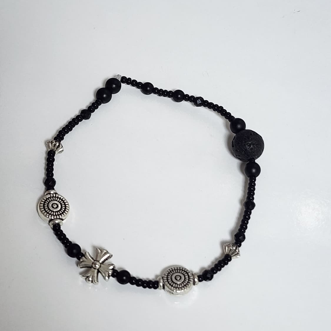 검정색 화산석이 들어간 십자가 팔찌에요 십자가와 실버 장식 디테일이 고급스러움을 더하고 평소에 착용하기 좋은 디자인이에요🖤 길이 17.5