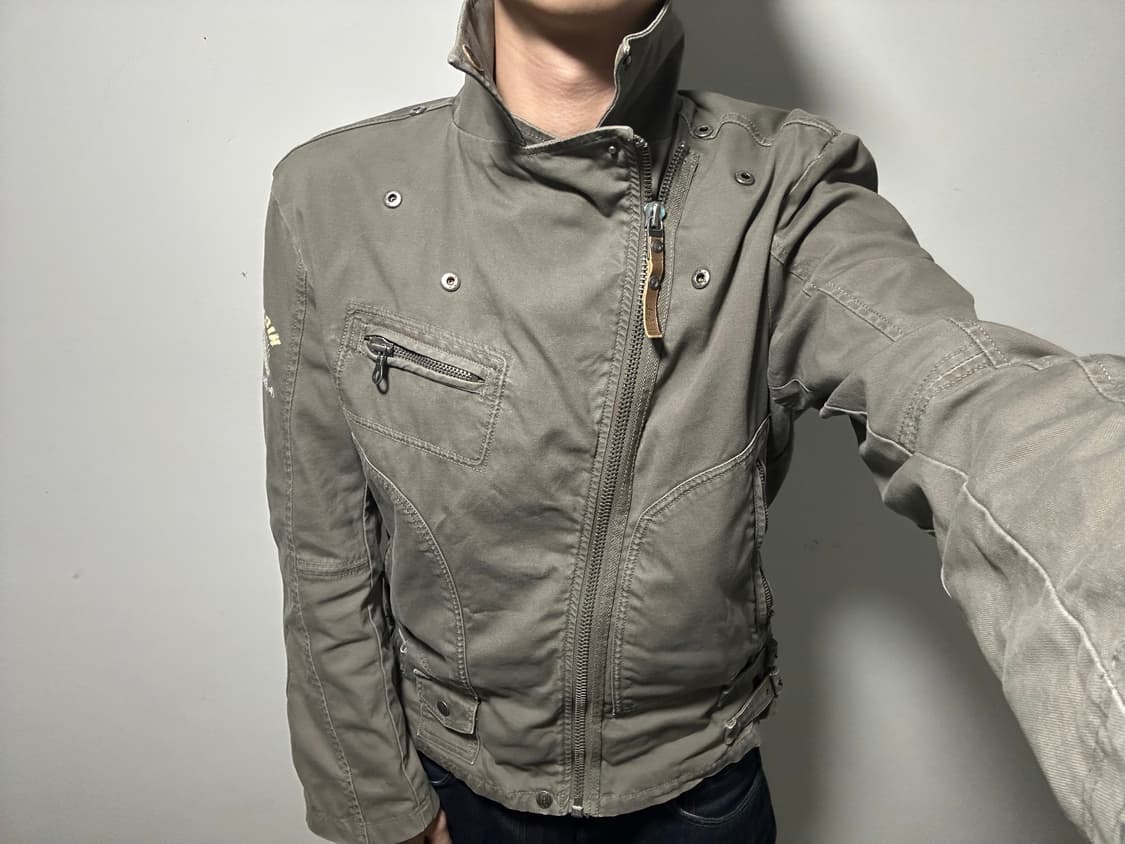 -디젤 코튼 라이더 자켓 -크롭한 기장, 100~105 입으시면 잘 맞습니다 -훌륭한 디테일, 사진 참고 부탁드립니다 -색상은 어두운 카키에 가까움
