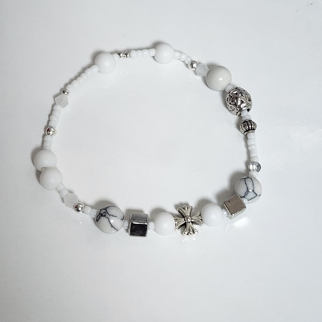 터키석이 들어간 남자 십자가 화이트 팔찌에요 흰색 비즈와 은색,실버 십자가, 큐브가 포인트인 팔찌랍니다 심플하면서도 세련된 디자인으로 어떤 스타일에도 잘 어울리고 예뻐요 ✨️ 길이 18.5