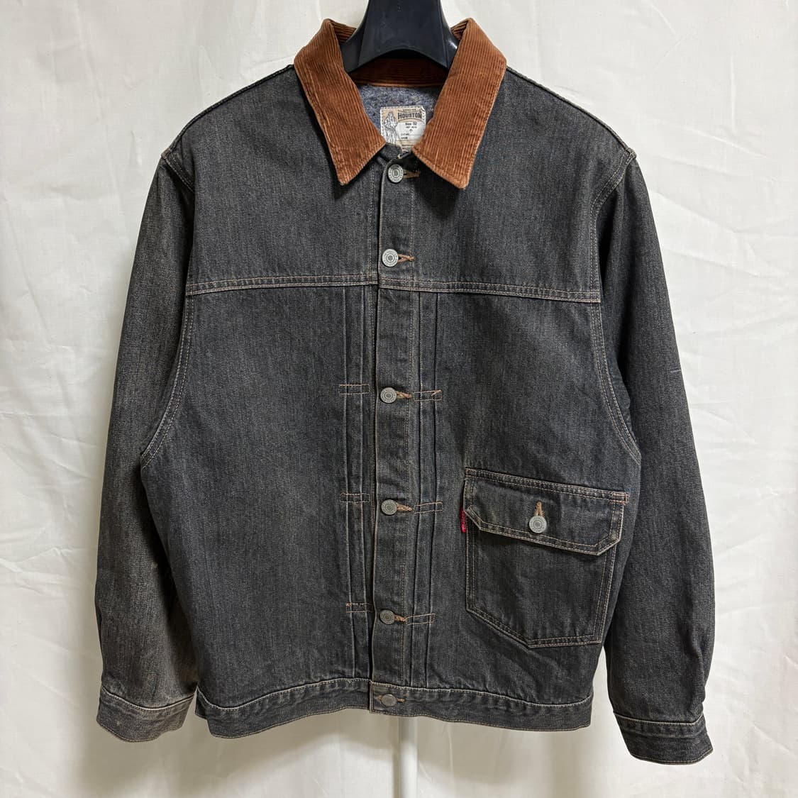 HOUSTON은 1947년부터 빈티지 밀리터리 의류를 수입해 수선하고 판매하던 개인 사업에서 시작되어, 1972년 Union Trading 주식회사를 통해 본격적인 브랜드로 전개된 아메리칸 캐주얼·밀리터리 복각 브랜드입니다. 휴스턴 1세대 데님 트러커자켓입니다. 코듀로이 카라배색감과 브라운톤이 감도는 흑청으로 컬러 배색감이 아주 좋습니다. 잘익은 페이딩으로 빈티지한 맛이 아주 멋지게 자리잡힌 제품입니다. 사진상 보여지는 상태 그대로이며 전체적으로 좋은 컨디션입니다. *실측사이즈* 어깨 45 / 가슴 52 / 소매길이 64 / 총기장 57