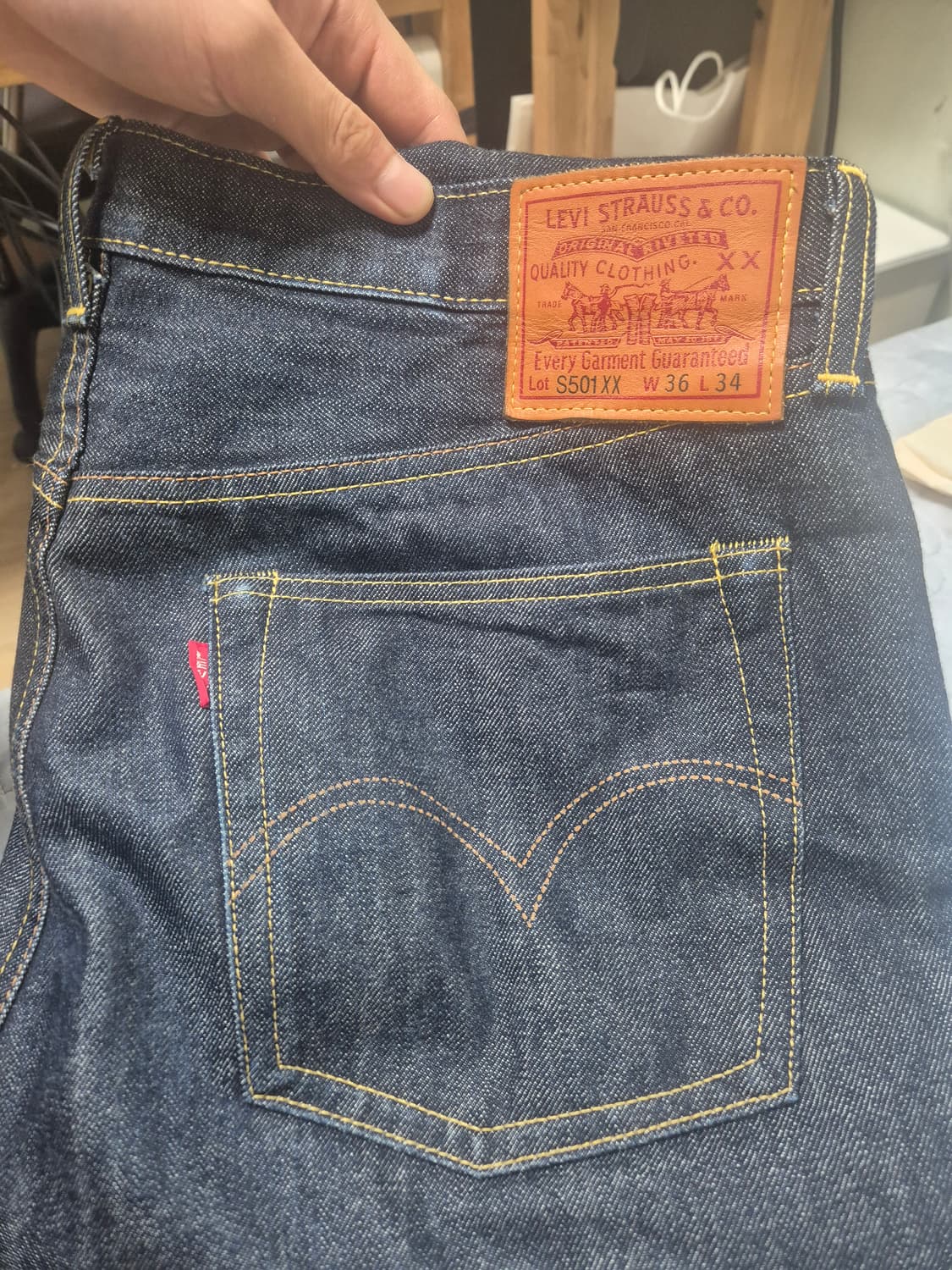 LVC 44501 W36 L34입니다. 아실분들은 다 아시는 셀비지 데님 정품 확실하고요 찬물세탁 한 두번했고 아직 워싱도 안잡힌 제품이니 입맛대로 길들이시면 될 것 같습니다 하자는 롤업하고 다녀서 그런지 밑단부분에 파란 줄이 옅게 생겨있네요 똑같이 롤업하시면 상관없을 것 같아요 한국사이즈로 34라고 생각하시면 될 것 같습니다