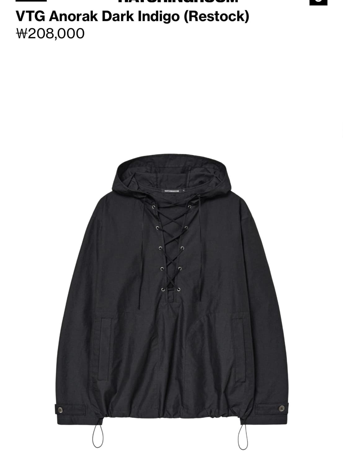 해칭룸 블랙 아노락 후드티 3사이즈입니다. 끈으로 조절하는 디테일이 포인트인 제품입니다. 빈티지한 무드가 느껴지는 블랙 색상입니다. 사용감있으며 실측표 참고.