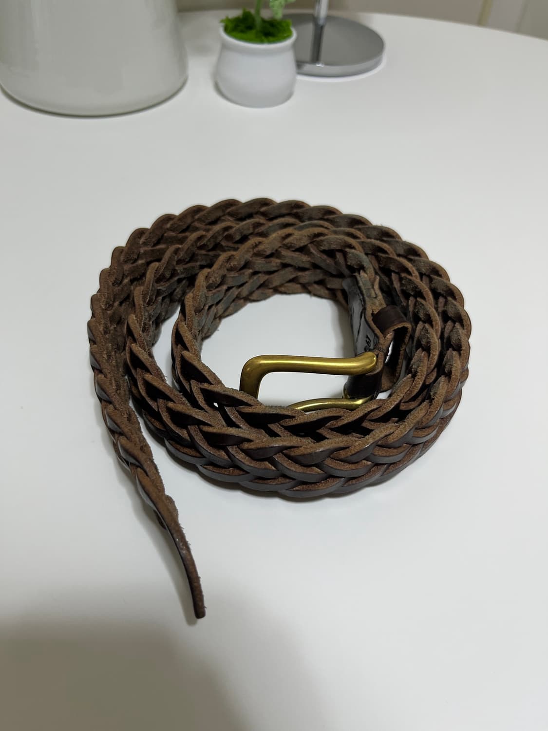 드레익스 위빙 벨트 브라운 미듐입니다 가죽 질이 너무 좋고 엄청 두껍습니다. 버클도 퀄이 좋습니다. 정말 좋습니다! 벨트 잘 안해서 판매하는데 만족하실겁니다. 매장 구매 후 집에서만 체결해봤습니다.
