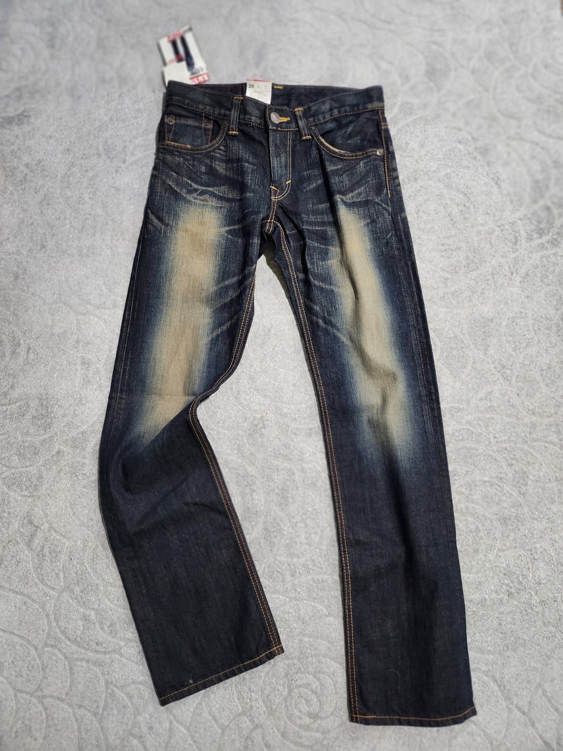 에드윈 데님 청바지 29인치 (새상품) EDWIN 제품으로, 자연스러운 워싱이 돋보이는 데님 팬츠입니다. 빈티지한 색감과 입체적인 워싱 디테일이 매력적이며, 과하지 않아 다양한 스타일에 매치하기 좋습니다. 기본 스트레이트 핏으로 부담 없이 데일리 착용 가능하며, 29인치 사이즈로 슬림하게 떨어지는 핏감을 보여줍니다. 8