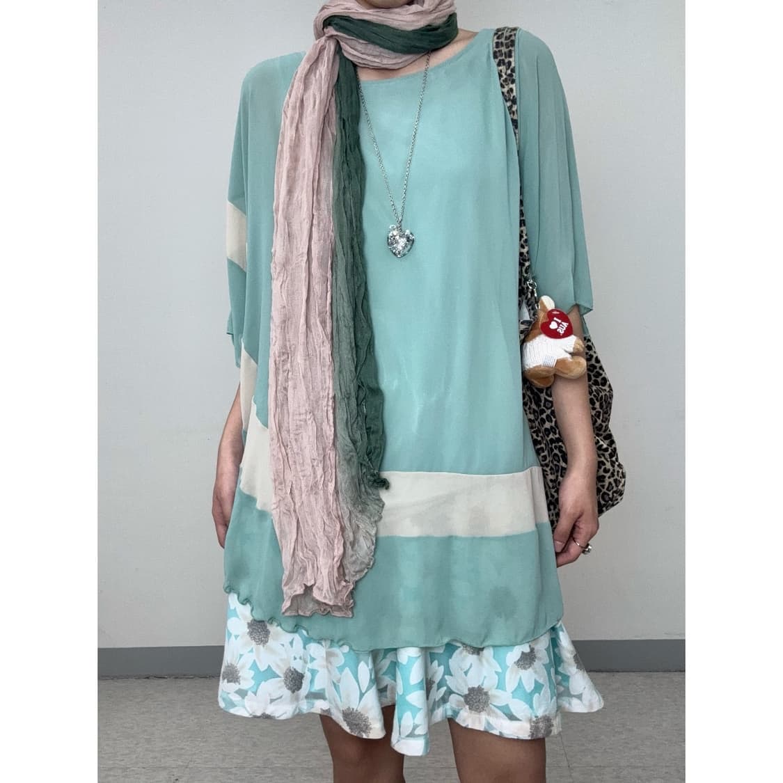 brand Alphabet’s alphabet fabric(%) 폴리에스터100 size(cm) 총장81 소매35 암홀23 - 언발란스한 소매 디자인과 트렌디한 민트 컬러가 매력적인 반소매 원피스 - 시원하고 가벼운 블라우스 소재 model 170cm 55size / 5만 원 이상 구매 시 무료배송