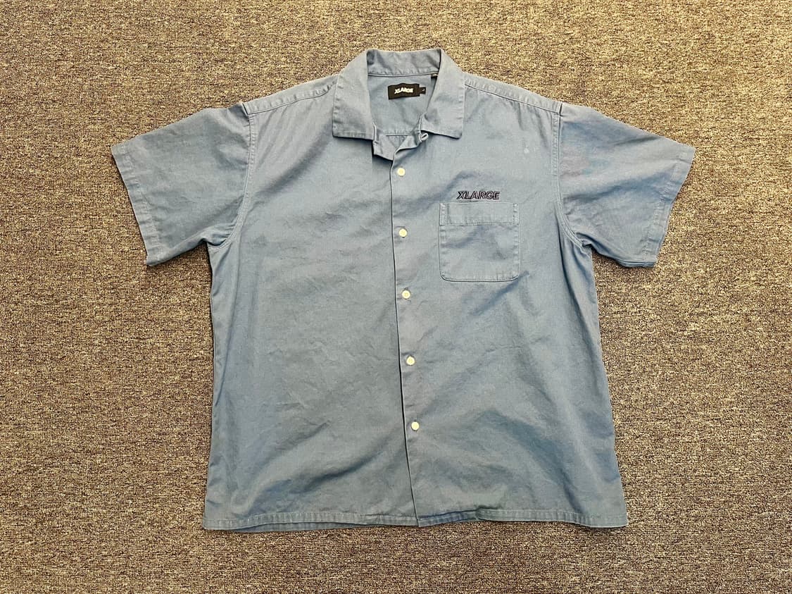 일본브랜드 엑스라지의 워크셔츠 입니다 빈티지한 느낌의 블루컬러에 뒷부분에 커다란 자수로고가 멋스러운 제품 입니다 특별한 오염이나 데미지 없습니다 사이즈 L (100~103) 우체국 무료배송