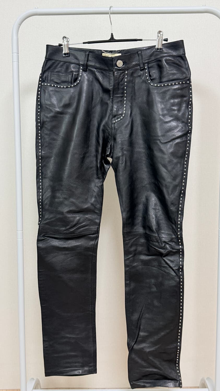 표기사이즈 46 허리 39 허벅지 26 밑단 16 총장 98 28-29 추천 가죽상태는 양호합니다 바지 뒤에 오른쪽 포켓 좌측상단 구멍이 있습니다 (수선필요) 그리고 스터드 옆에 아주 미세한 자국 있습니다 (스터드에 눌린) 그리고 바로 옆에 단순 보강 있습니다 하자에 의한 보강x 구멍 빼고는 상당히 깔끔한 바지입니다