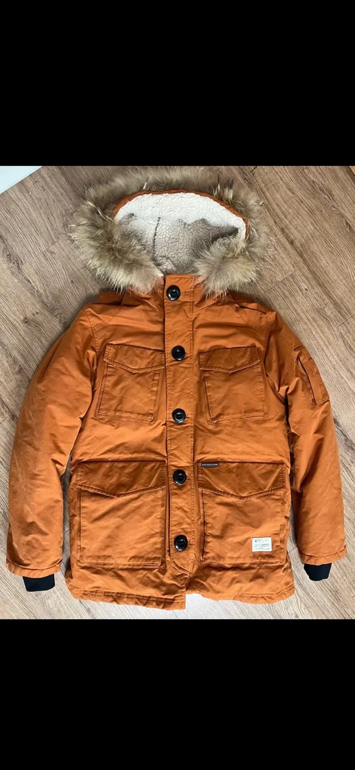 빈폴의 브랜드인 바이크리페어샵의 중기장 패딩입니다. 상태 좋습니다. 부담스럽지 않은 오렌지 컬러로 예쁩니다. 허리와 후드 조임끈 있고, 투웨이 지퍼로 핏 조절해서 입기 좋습니다. 라쿤털은 탈부착 가능합니다.