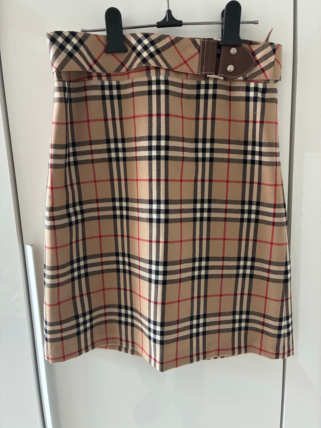 버버리 베이지 노바체크 버클 플리츠 미디스커트