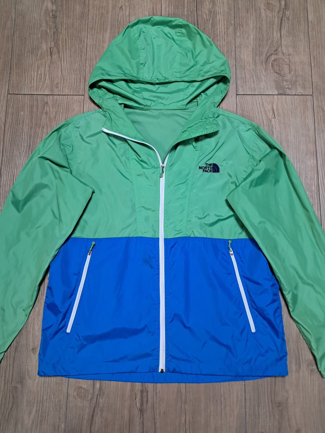 상태 깨끗합니다 사이즈L 가슴55 총장67 어깨49 팔68 나일론 도톰하고 탄탄한 재질 포켓2 (지퍼) 밑단 스트링 후드일체형 자수로고 그린 블루