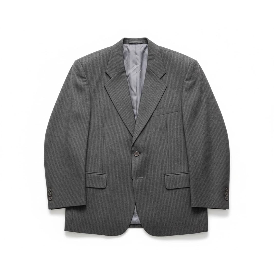 입생로랑 옴므 정장 자켓이에요 사진에서 보이는 것처럼 세로 스트라이프 패턴이 멋스러워요 사이즈는 38R이며, 가슴 94cm, 허리 82cm, 신장 165cm에 맞춰 나왔어요 깔끔한 디자인으로 어떤 하의와도 잘 어울려요 실측: 어깨45 가슴46 팔57 총장80