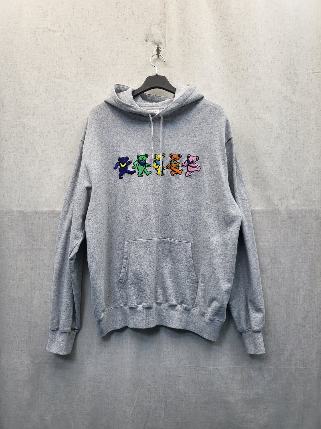 디스이즈네버뎃 GD Dancing bear 후드입니다. 곰돌이 자수가 귀엽게 포인트로 들어가 있습니다. 무난한 회색 후드라 코디하기도 용이할 것 같아요. 가슴단면 65 총장 72 반품불가