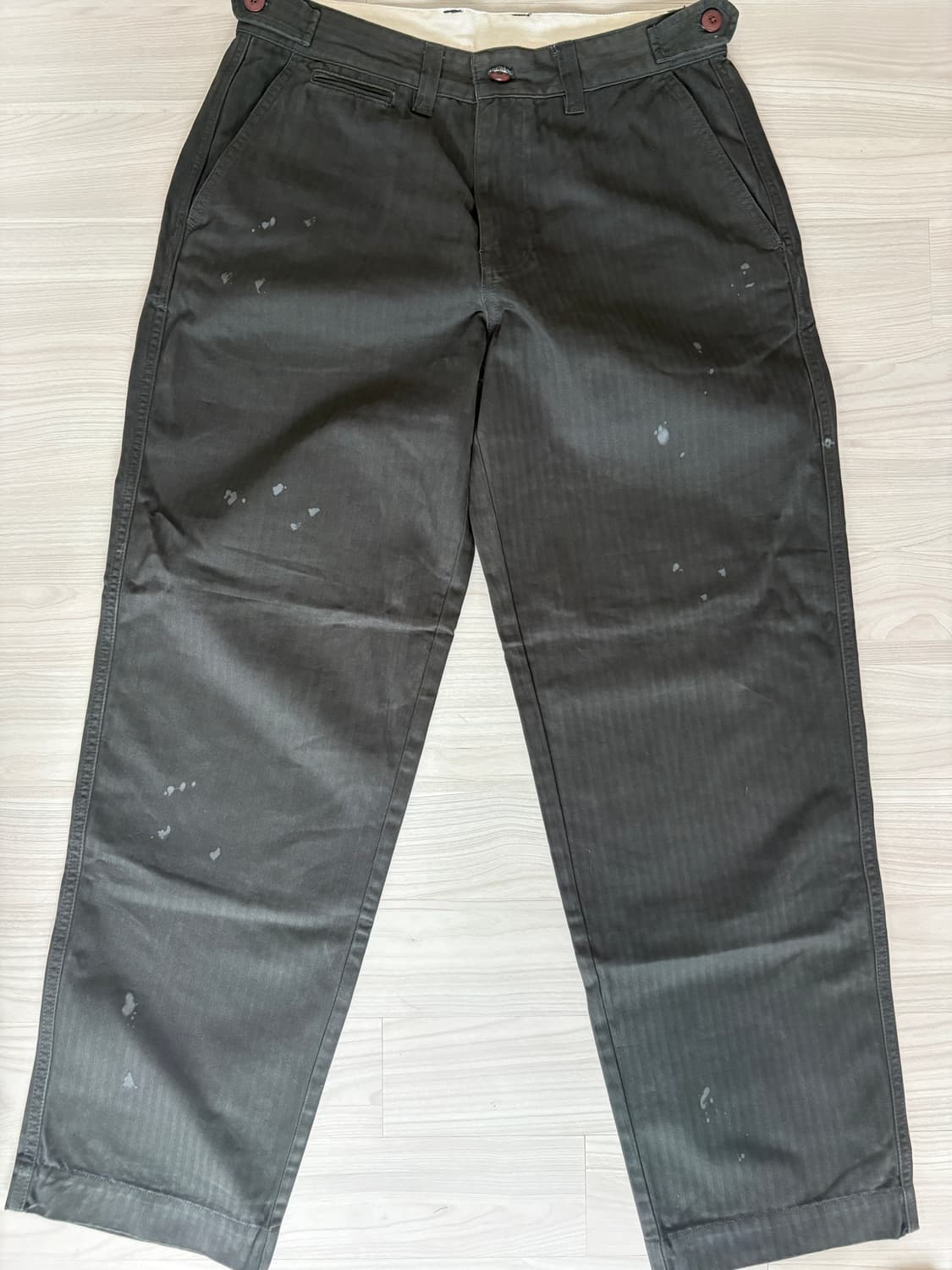 유니폼브릿지에서 나온 HBT M43 치노팬츠입니다. 군데군데 페인트가 묻어있는 워크웨어 느낌의 바지입니다. 빈티지한 멋이 살아있는 제품입니다. 사이즈는 L 32 사이즈 에눌가능해여 새상품 입니더 저렴히 가져가세요^^