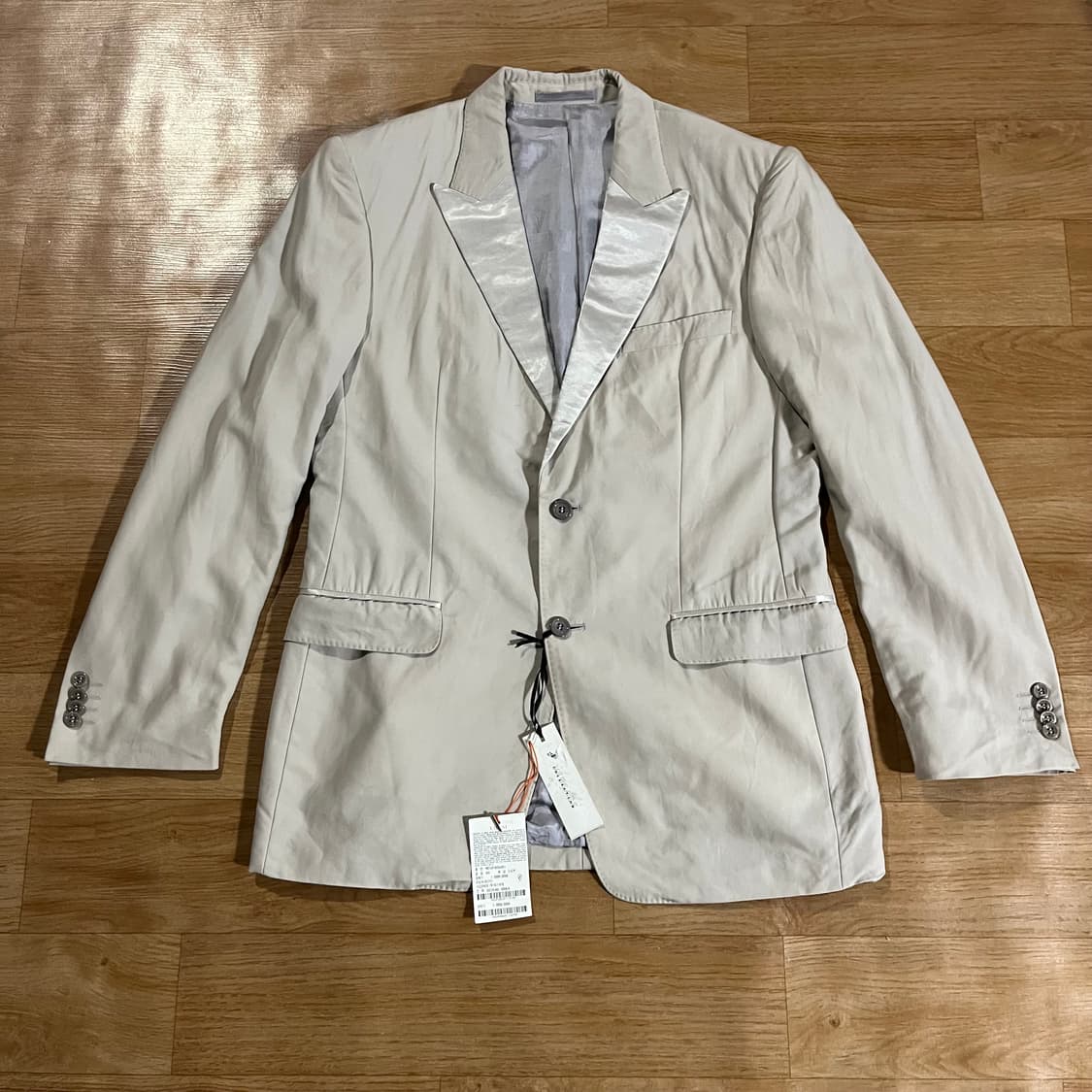 정품 베르사체 컬렉션 턱시도 정장 수트 미사용 새상품. 라이트 베이지 울 폴리 혼방 춘추용 실버 배색. 피크드 라펠 투버튼 사이드벤트, 노턱 일자핏 이태리 초고가 명품 브랜드. 리테일가 198만 사이즈 상의 50 (105권장) 총기장 78 가슴단면 54 어깨선 46.5 팔길이 65 하의 50 (33권장) 총기장 115 허리단면 43 허벅지 34 밑단 20 반품 환불 안되니 신중구매 해주세요.