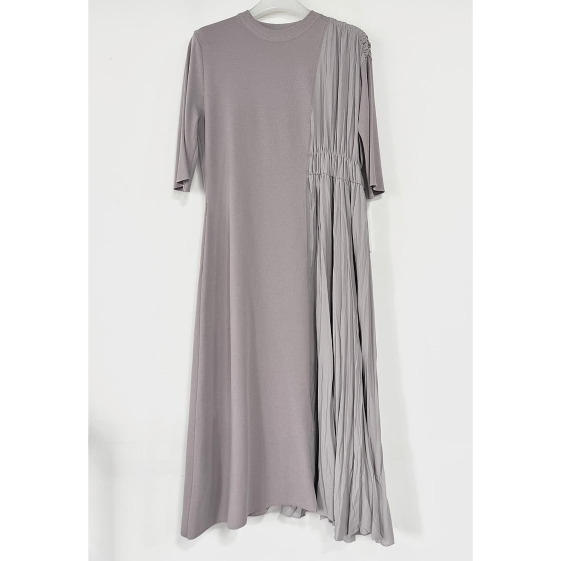 한섬 시스템 롱 니트 드레스예요. 한쪽 면이 플리츠 디자인으로 배색되어 있어 걸을 때마다 찰랑이는 실루엣이 무척 우아하고 세련된 아이템입니다. 차분하고 은은한 색감이 돋보이는 라벤더 컬러로 고급져 단독만으로도 예뻐요. 데일리부터 하객룩이나 데이트룩처럼 격식 있는 자리에도 잘 어울려요. 벨트 따로 없어요.