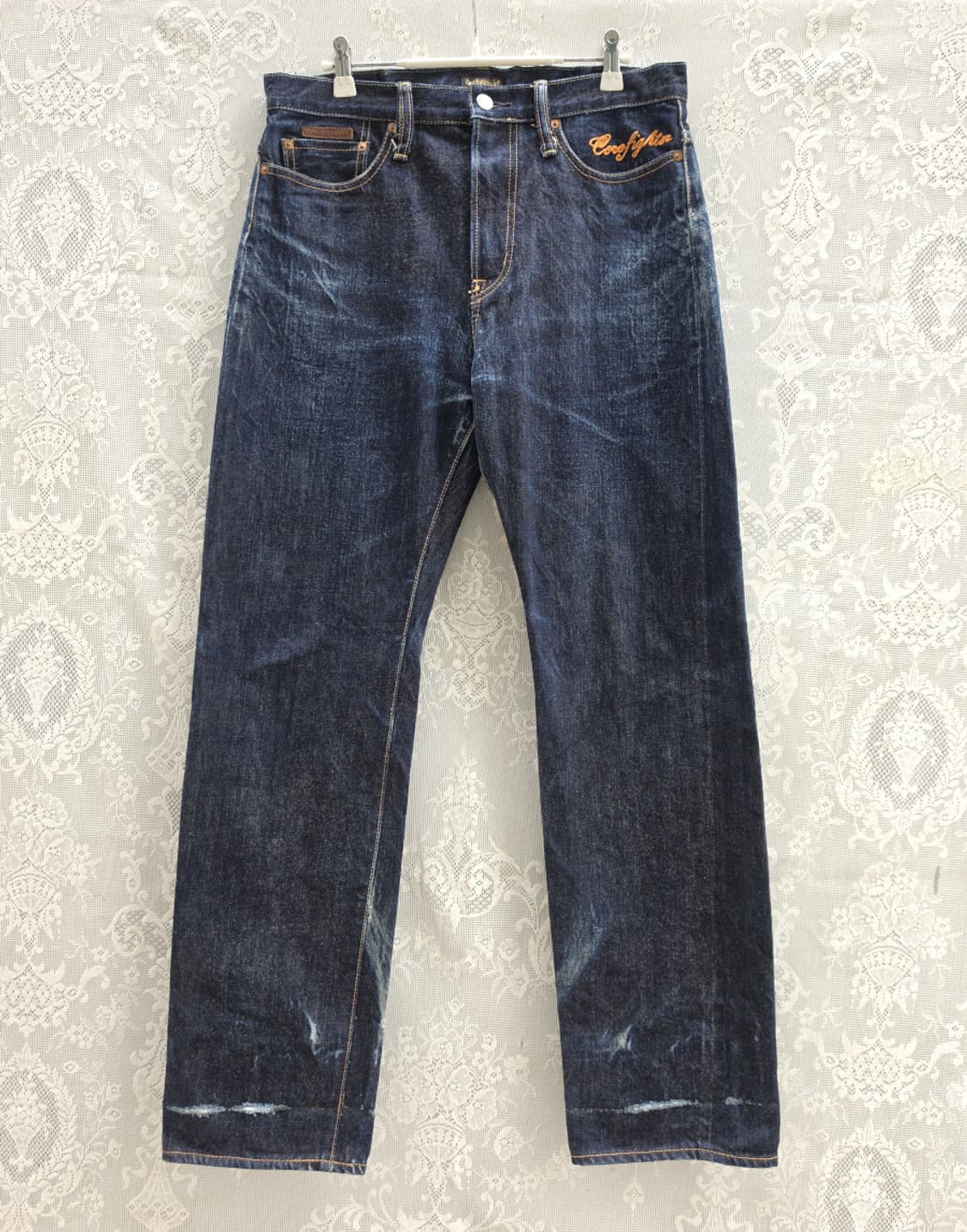 총장: 106cm 허리 : 42 cm 미디:31 cm 허벅 : 30 cm 밑단 :20cm 소재: 면 100 % 표기사이즈 미디엄 안녕하세요~ 봐주셔서 감사합니다. 90년 후반 00s 초반에 일본 스트릿패션 황금기를 이끌던 코어파이터입니다. 지금은 없어져서 희소해졌네요~ 온스 높은 셀비지 원단으로 진청도 많이 남아있습니다. 지퍼는 명품 유니버셜이네요. 밑단 체인스티치 살아있고~ 밑단 데미지가 보이지만 기장이 길어 밑단 살려 수선하셔도 되겠습니다. 32-33인치