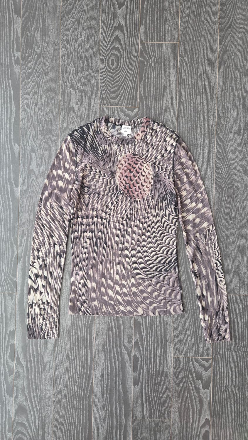 - Jean Paul Gaultier HOME - 옵티컬 웨이브 패턴 파워넷 롱 슬리브 - 사이즈: 48 (남성 슬림 100 / 여성 55~66 오버핏 권장) - 소재: 나일론 100% (Made in Japan / 온워드 카시야마 정품) - 상태 좋음