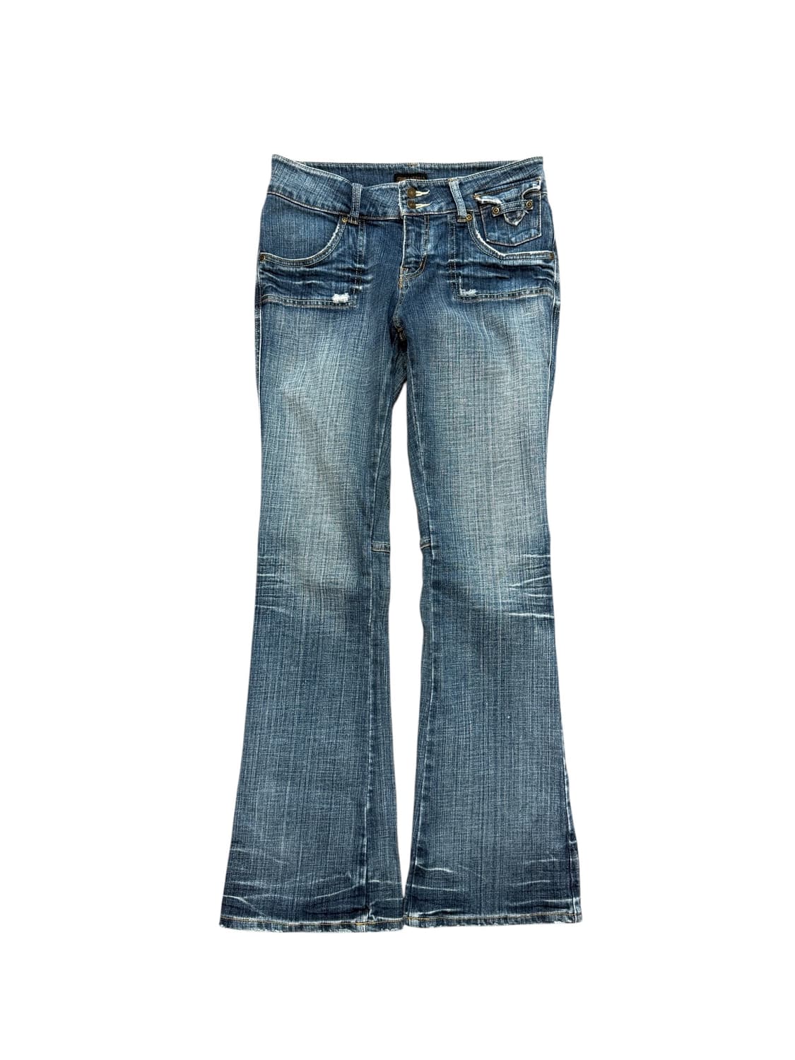 Sand washed scratch flared denim