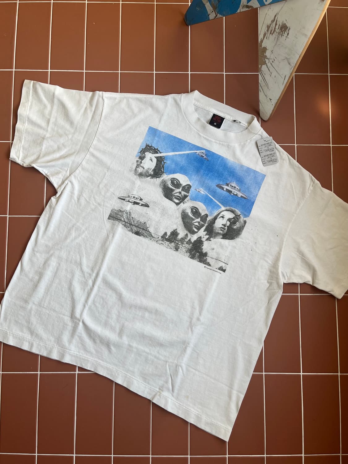 컨디션: NEW 세인트미카엘 션 우더스푼 콜라보 티셔츠입니다. 뒤 한자가 “위기” 일본어 칸지로 “키키” 로 이름이 키키 티셔츠입니다. 션 우더스푼을 개인적으로 좋아하는데요. 미국 러시모어산과 외계인 침공을 위트있게 표현한 아트웍과 색감이 마음에 들어 구매했으나 사이즈가 크네요… 실물 색감과 느낌이 좋습니다!!! 실제로 오래 입은 듯한 자연스러운 프린팅 질감과 색감, 옛 미국 티셔츠의 디테일 고증들은 세인트미카엘 티를 좋아할 수 밖게 만드는 것 같습니다! 군데군데 페인트 자국과 얼룩들도 멋있구요. 세인트미카엘 좋아해서 여러 장 입고 있는데 정말 괜찮은 제품입니다! 상대적으로 저렴한 가격에 세인트미카엘 감성 느껴보시고 기회에 션 우더스푼에도 관심 가져보시는 계기가 되었음 좋겠습니다 :)