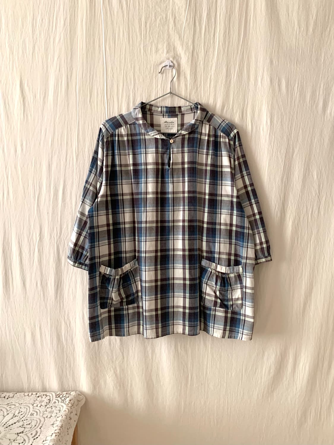 ♫彡。.:・¤゚♫彡。.:・¤゚♫彡。.:・¤゚♫彡。.:・*゚ 블루 체크 둥카 블라우스입니다.ᐟ 7부 소매이구요 앞쪽에 둥근 포켓이 달려있어 정말 귀여워요 넥라인에 작은 나무 단추가 달려있답니다♡ ⇢ 가슴단면: 62 총장: 66 ⇢ 가격: 2.6 모델 사이즈 → 157/54, 하의 27(m)