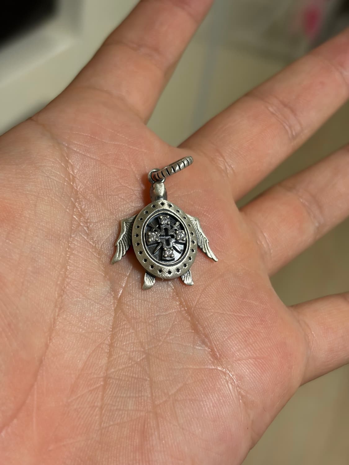 거북이 등껍질의 십자가 문양과 날개 디테일이 돋보이는 유니크한 디자인입니다. 흔한 디자인이 아니라서 남녀 구분 없이 포인트 아이템으로 쓰기 좋습니다. 정가 11만 원에 구매한 뒤 한 번도 착용하지 않은 새 제품입니다. 궁금한점 있으시면 편하게 연락주세요!