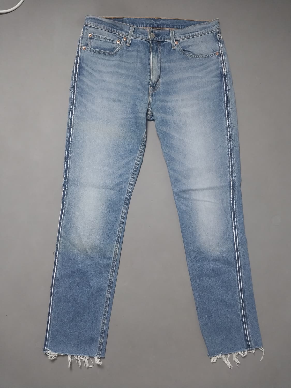 ㅡ하의 제품명 511 사이드라인 슬림진 ●사이즈 34 inch ●컨디션 8 /10 511 워싱 슬림진 베이스에 사이드라인에 덧댐 디자인이 들어간 커스텀진 입니다. 밑단은 컷팅 디자인입니다. 엘라스틴 1%가 함유된 탄성있는 얇은 봄가을용 청바지입니다. ●실측 (단면 cm) 허리단면 43.5 엉덩이단면 54 허벅지단면 31 밑단면 18.5 밑위 34 총장 108 •1~3cm 오차가 있을 수 있습니다. ●빈티지 제품이라 정품 확실한 것만 기재합니다. ●택배는 평일 오후 3시 이전 토요일 오전 10시 30분 이전 주문시 당일 보내드릴게요. ●2개 이상 5만원 이상 주문시 무료 배송입니다. ●매너 없는 분, 갑질하는 분과는 거래불가입니다. ●네고 문의는 따로 답장드리지 않습니다. 저희가 드릴 수 있는 적정가에 드리고 있습니다. 30%네고 및 무료배송 찔러보기 자중해주세요. ●구제 특성상 반품이나 환불은 불가입니다. ● 발견하지 못한 하자나 얼룩이 있을 수 있습니다. 대량 세탁 후 판매 하지만 사용 전에 한번 더 세탁 부탁 드립니다. ● 긴 글 읽어주셔서 감사드립니다.^^
