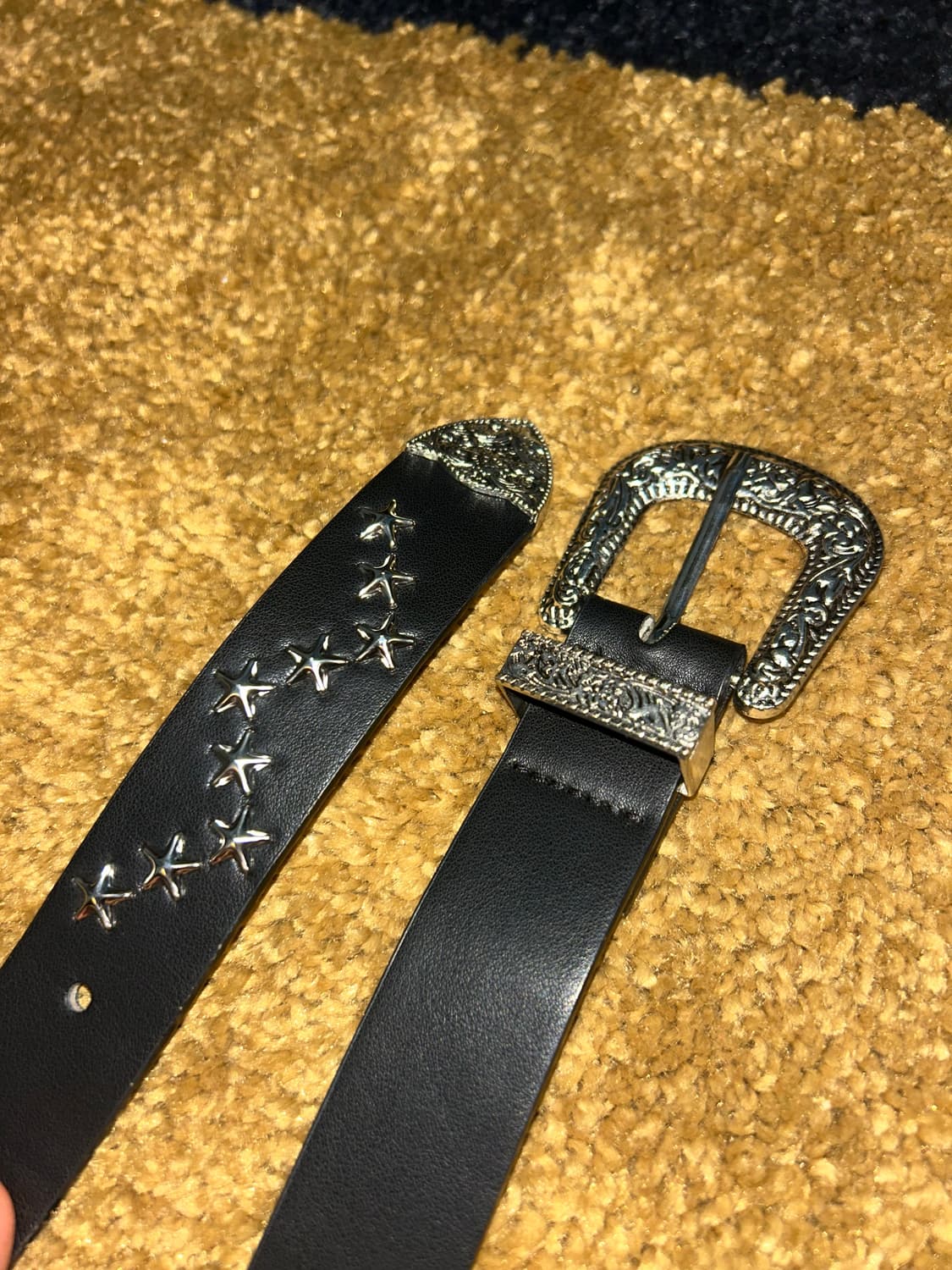 웨스턴 스타 스터드 디테일 벨트 입니다. 링클 가죽 디테일이 이쁜 제품입니다. 각 리벳들도 이쁘게 배열되어있어 어떤 바지에도 디테일을 살릴 수 있습니다.