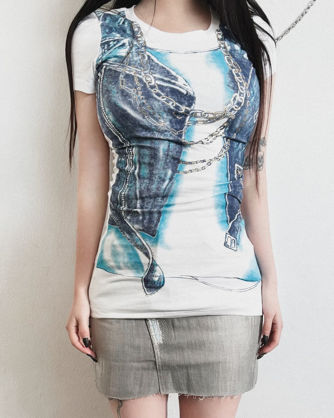 dolce & gabbana trompe-l’œil tee 베스트와 레이어 체인을 트롱프뢰유 기법으로 표현한 티셔츠. womens M (~55) shoulder 39 chest 44 sleeve 18 length 58 price : 150,000 (인스타그램 주문 or 매장 방문시 10% 할인) ig : @jeanand.juice
