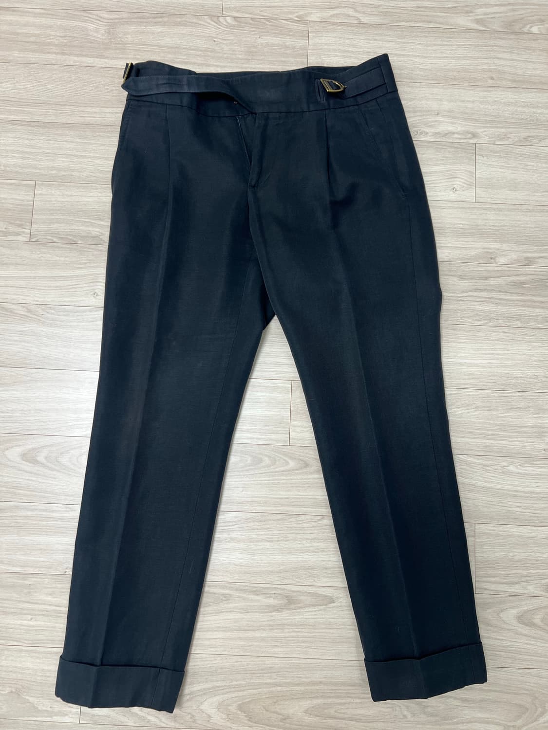 구찌 코튼 블랙 구르카 팬츠 입니다. 연식(미켈레 전 구찌)은 좀 있지만 상태는 좋습니다. 봄/가을용 원단입니다. 172/69 신체 사이즈로 기장은 턴업(5cm) 수선한 제품입니다. 실측: 허리둘레80, 엉덩이둘레105, 허벅둘레64, 바지부리 단면17.8, 아웃심기장91, 인심기장68.5 수수료/배송비 포함 가격입니다.