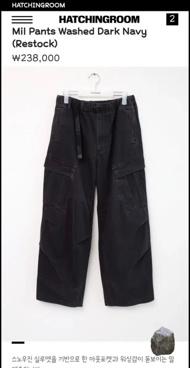 해칭룸 밀 팬츠 워시드 다크 네이비 2사이즈 입니다 올해 1월에 구매하고 1회착 후 스타일 변화로 판매합니다! 상태는 그냥 새재품 입니다 택 포함이에요!