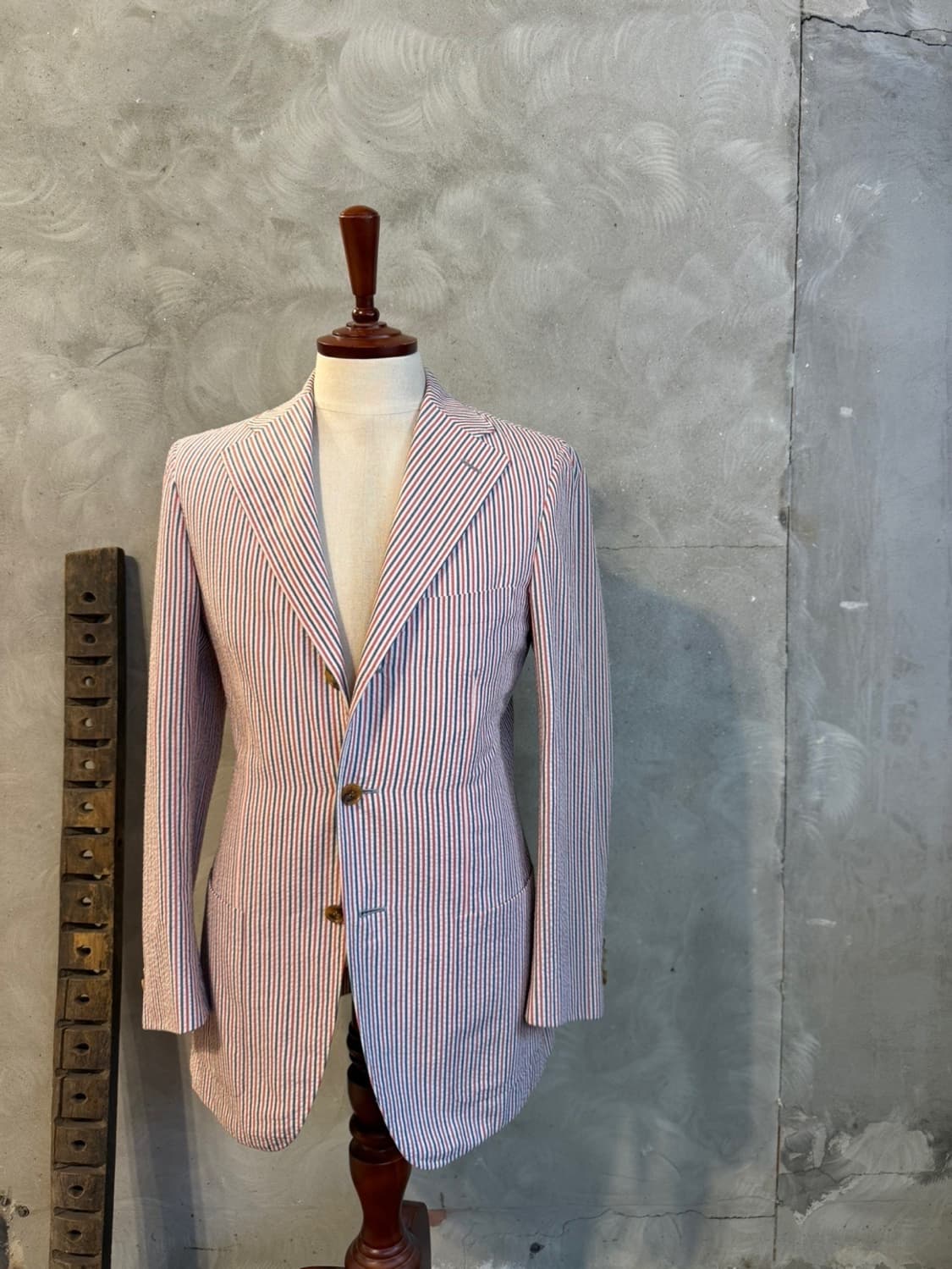 시어써커패브릭의 웨어러블한 질감과 아름다운 발색을 지닌 태도에 랄프로렌의 퍼플라벨 등 하이엔드 브랜드부터 지방시나 마르니 등등의 디자이너 브랜드의 OEM을 담당하기도 하고 수준 높은 자체 PB를 선보이는 라파엘 카루소 최상위 공방에서 재단된 테일러드자켓입니다. 사이즈 이탈리아 46으로 국내 100 정사이즈 권합니다. 감사합니다.