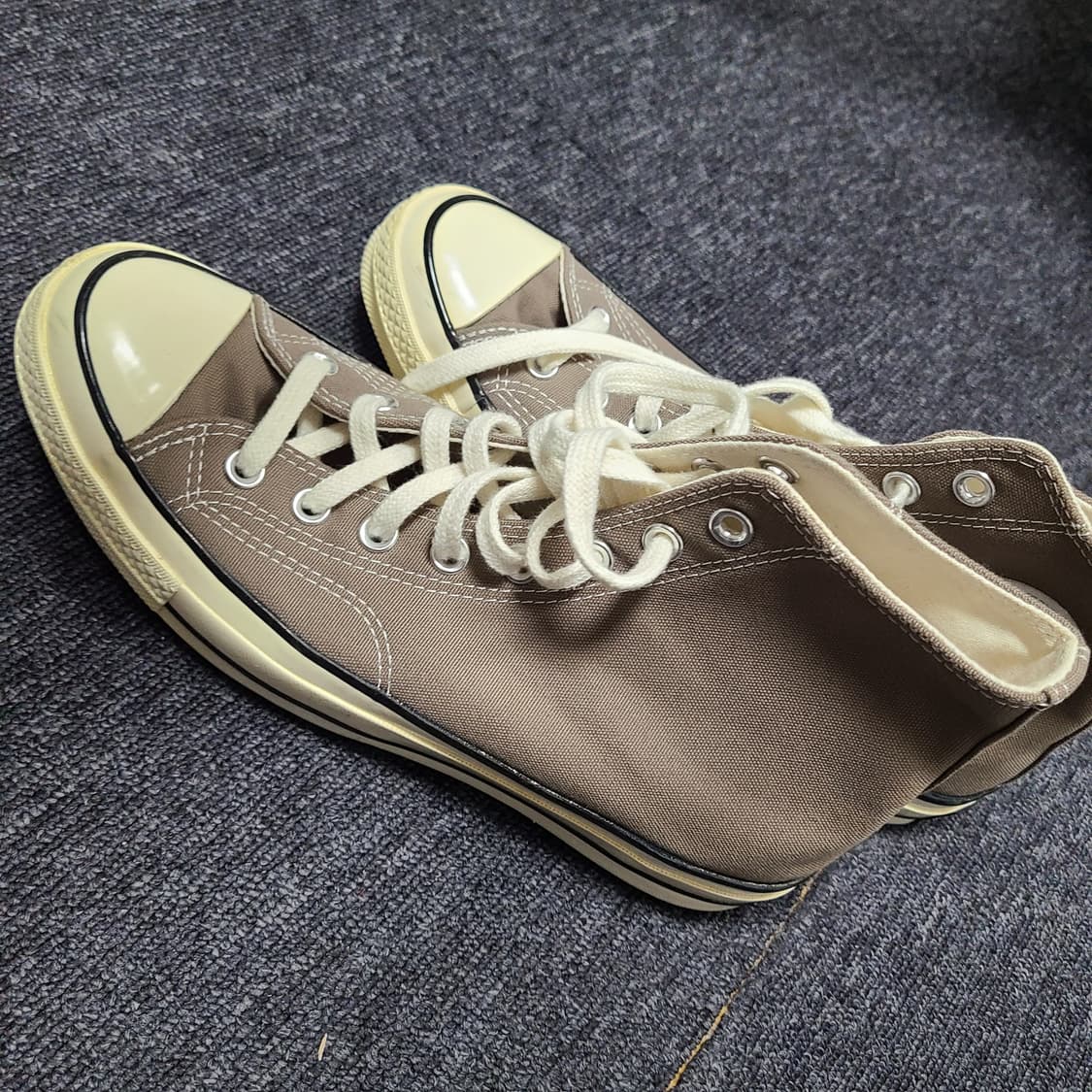 컨버스 척테일러 70 모카 색상 270사이즈입니다. 끈은 아이보리 색상으로 교체했습니다. 실착 횟수 5회 미만이라 상태 좋습니다. 문의 없으시면 바로 안전결제해주시면 됩니다!
